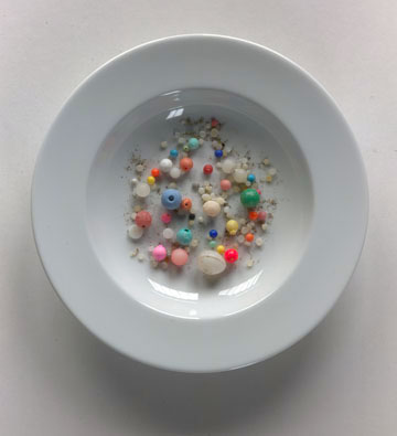 Our soup bowls are filled with beach plastic, nurdles and baby binkys all found on Kehoe Beach.